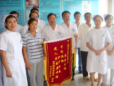 宋應(yīng)學(xué)老家是貴州省開陽(yáng)縣龍崗鎮(zhèn)人,來莆田打工已8年了。7月30日,45歲的宋應(yīng)學(xué)突然腹痛難忍,急送莆田盛興醫(yī)院救治,經(jīng)診斷為:膽總管結(jié)石。馬上進(jìn)行膽總管切開取石手術(shù),由外科副主任醫(yī)師邱松林主刀,手術(shù)進(jìn)行順利。術(shù)后一個(gè)多月來,病人恢復(fù)得很好。病人及其家屬對(duì)醫(yī)護(hù)人員的精心治療和照顧非常的滿意,故贈(zèng)送錦旗以表感激之情。