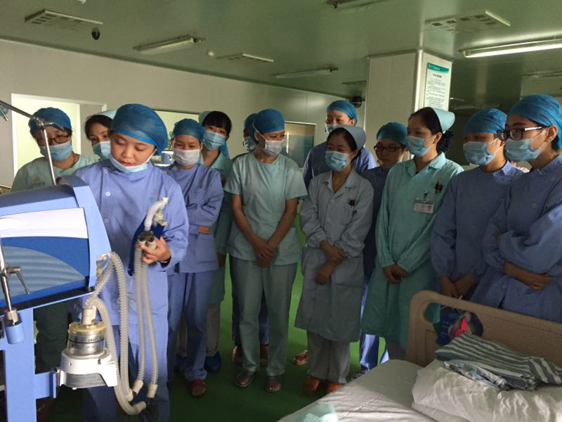 2016年11月3日,護(hù)理部組織各科護(hù)士在ICU學(xué)習(xí)呼吸機(jī)的使用。