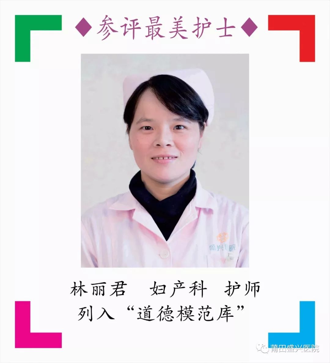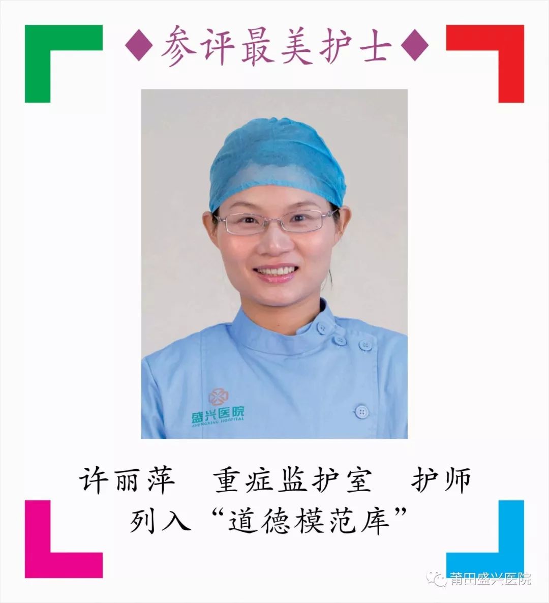 秀嶼區(qū)衛(wèi)計局2018年11月29日發(fā)出《秀嶼區(qū)衛(wèi)計局關(guān)于基層“較美醫(yī)生(護士)”評選結(jié)果的通知》,按照公開、平等、競爭、擇優(yōu)的原則,經(jīng)民主推選、考核、公示等程序,推選了30名的醫(yī)生(護士),均列入道德模范庫,其中盛興醫(yī)院5名醫(yī)護人員,他們分別是吳浦生、莊姞、林麗君、許麗萍、熊湘粵。