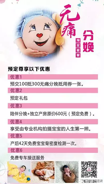 即日起,預(yù)約無(wú)痛分娩有優(yōu)惠哦,想要了解“無(wú)痛分娩”的準(zhǔn)媽媽們,可以認(rèn)真查看下面的套餐圖片,選擇適合自己的套餐,歡迎致電5619111進(jìn)行預(yù)定,預(yù)定有禮!