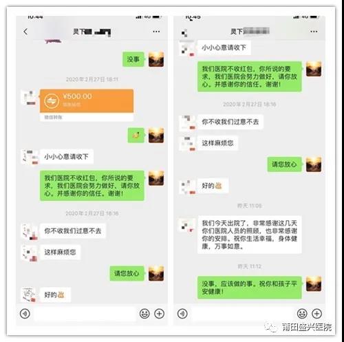 一則:患者在院期間對醫(yī)護(hù)人員的服務(wù)甚感滿意,想以紅包表達(dá)感謝,但被外聯(lián)部蔡總第一時間拒收。