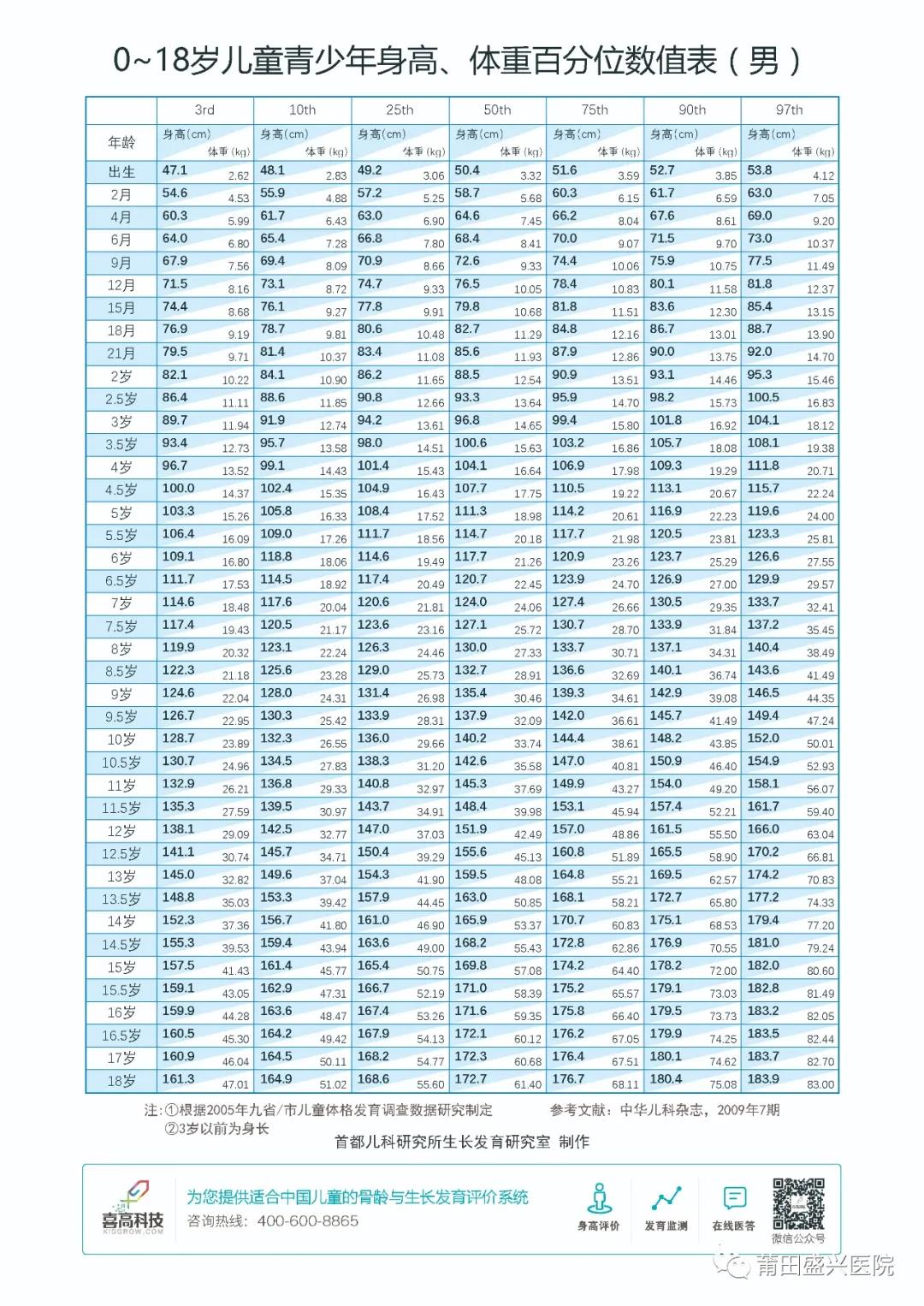 具體標(biāo)準(zhǔn)見下面兩張0~18歲孩子身高、體重?cái)?shù)值表,請(qǐng)家長(zhǎng)惠存對(duì)照。