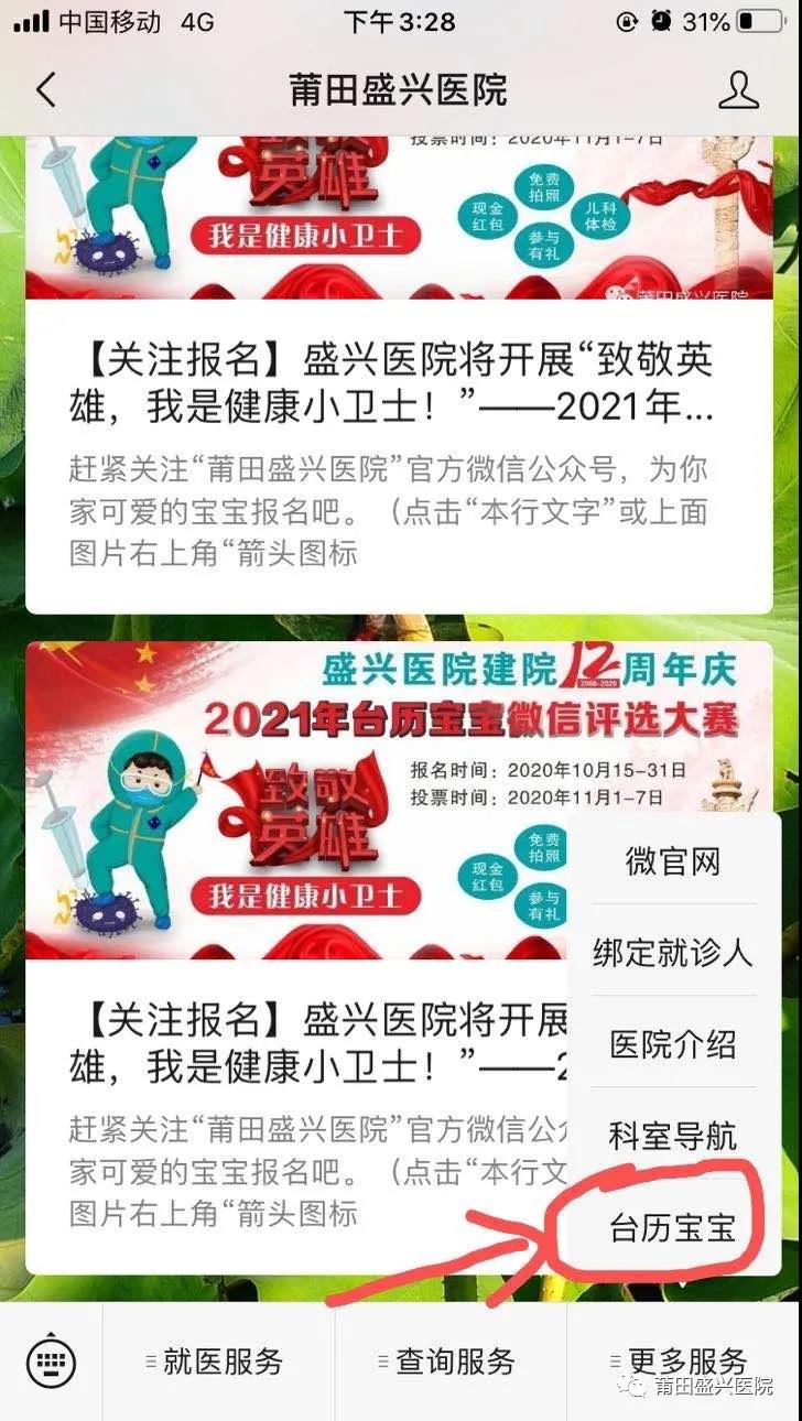 2、報(bào)名時(shí)間10月16日-31日,報(bào)名可以從本文開頭處或公眾號菜單欄(更多服務(wù),界面如下圖)找到“臺歷寶寶”后,按照提示上傳“照片+姓名+聯(lián)系電話+參賽宣言”,照片要求寶寶單人清晰照片1-3張,像素1M左右,最好為藝術(shù)照。