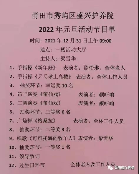 12月31日上午,莆田盛興護養(yǎng)院為長者們舉辦了“慶元旦迎新春”聯(lián)歡會及12月份的長者生日會。