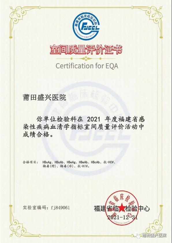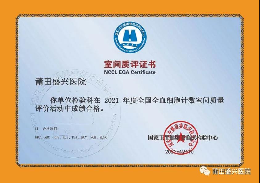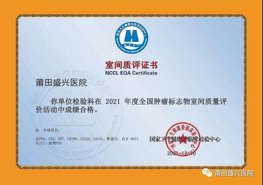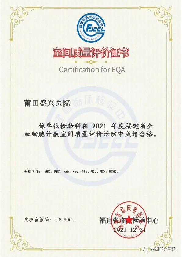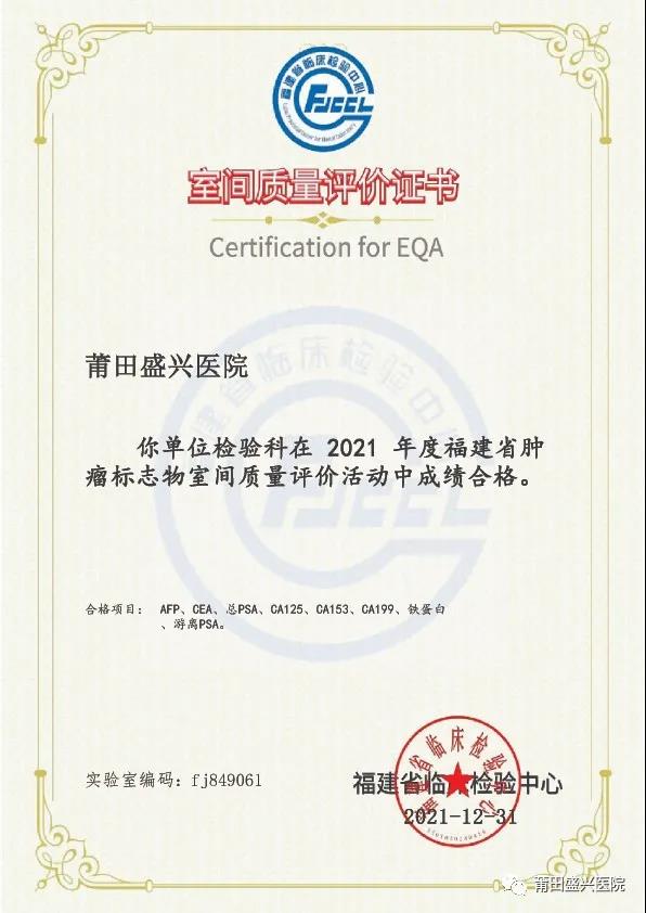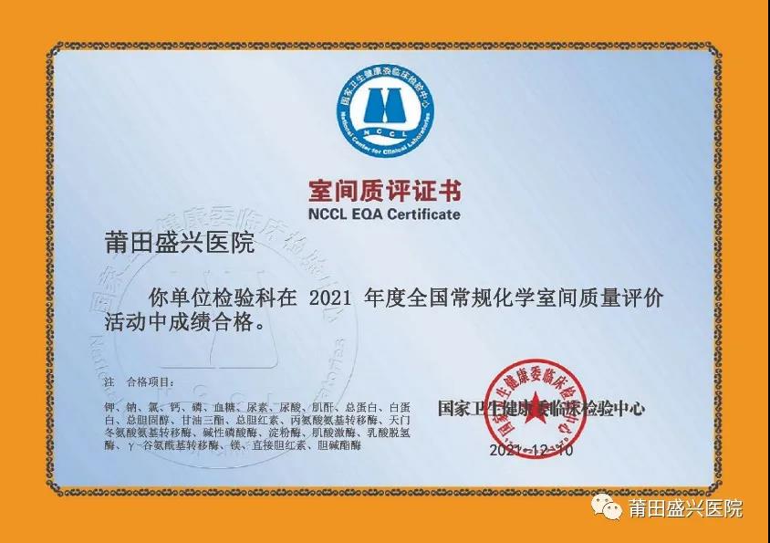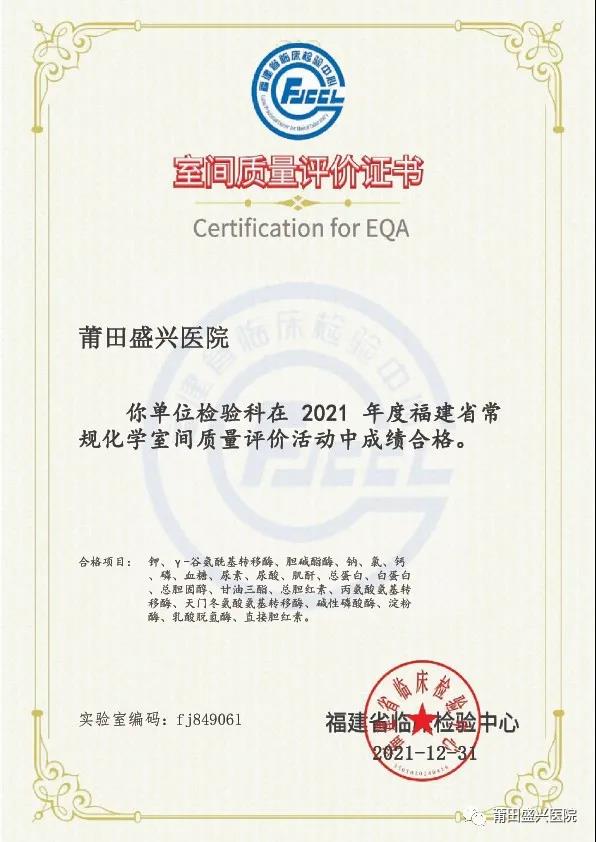 (下面圖片為2021年參加福建省常規(guī)化學(xué)室間質(zhì)量評(píng)價(jià)獲得的證書)
