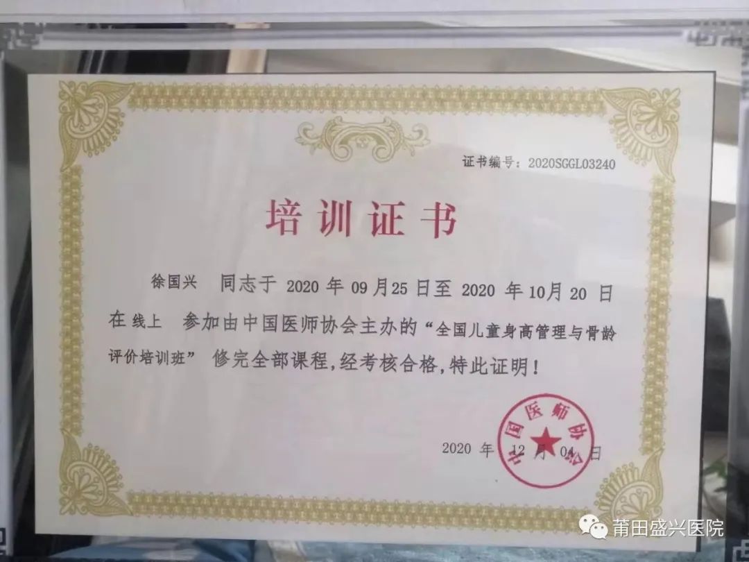 2020年師從莆田市第一醫(yī)院李金水主任,進修學(xué)習(xí)“矮小癥、性早熟”相關(guān)知識,對“矮小癥”、“性早熟”診療能夠熟練掌握。并順利通過國家醫(yī)學(xué)委員會舉辦的第20屆骨齡學(xué)習(xí)培訓(xùn)班,并取得骨齡評定合格證書。