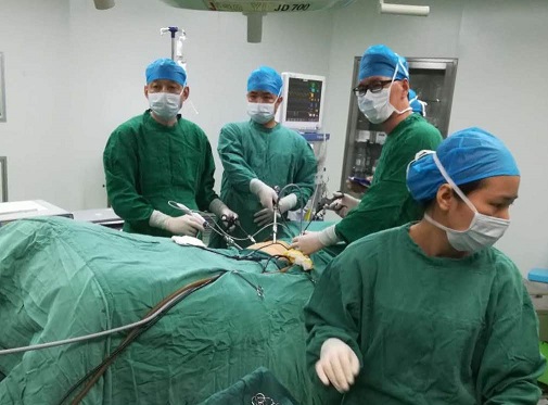 在經(jīng)急診檢查,發(fā)現(xiàn)傷者有創(chuàng)傷性巨大膈疝,胃體大部分通過左側(cè)橫隔進(jìn)入左側(cè)胸腔內(nèi),左肺被嚴(yán)重壓縮。為了保證傷者生命,爭取搶救時(shí)間,外科成濤主任在與傷者家屬經(jīng)過交流溝通之后,立即組織醫(yī)護(hù)人員,通過手術(shù)室、麻醉科等協(xié)作科室,為其施行急診下“左側(cè)膈疝復(fù)位及膈肌修補(bǔ)術(shù)+左側(cè)胸腔閉式引流術(shù)”。